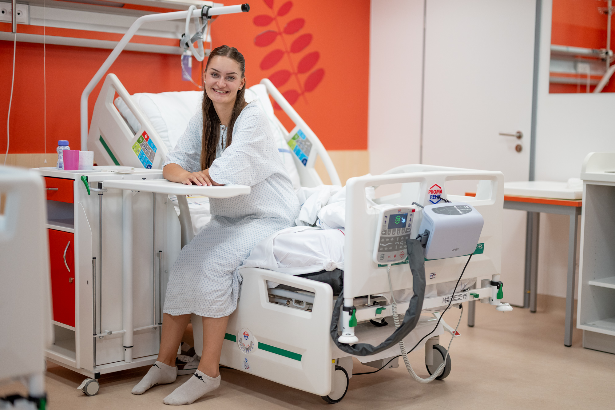 Velký rozsah zdvihu ložné plochy zmenšuje námahu ošetřujícímu personálu a usnadňuje manipulaci s ležícím pacientem. Nejnižší poloha ložné plochy lůžka napomáhá pacientovi při vstávání.